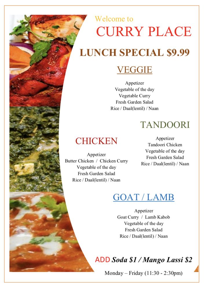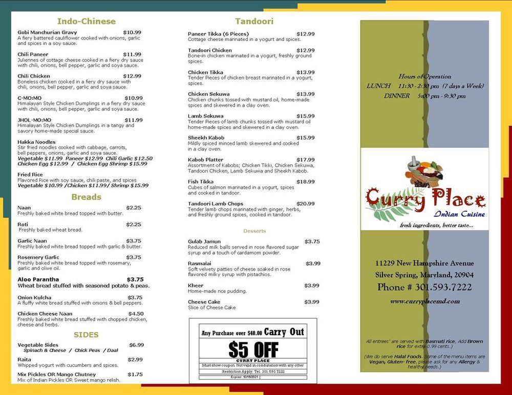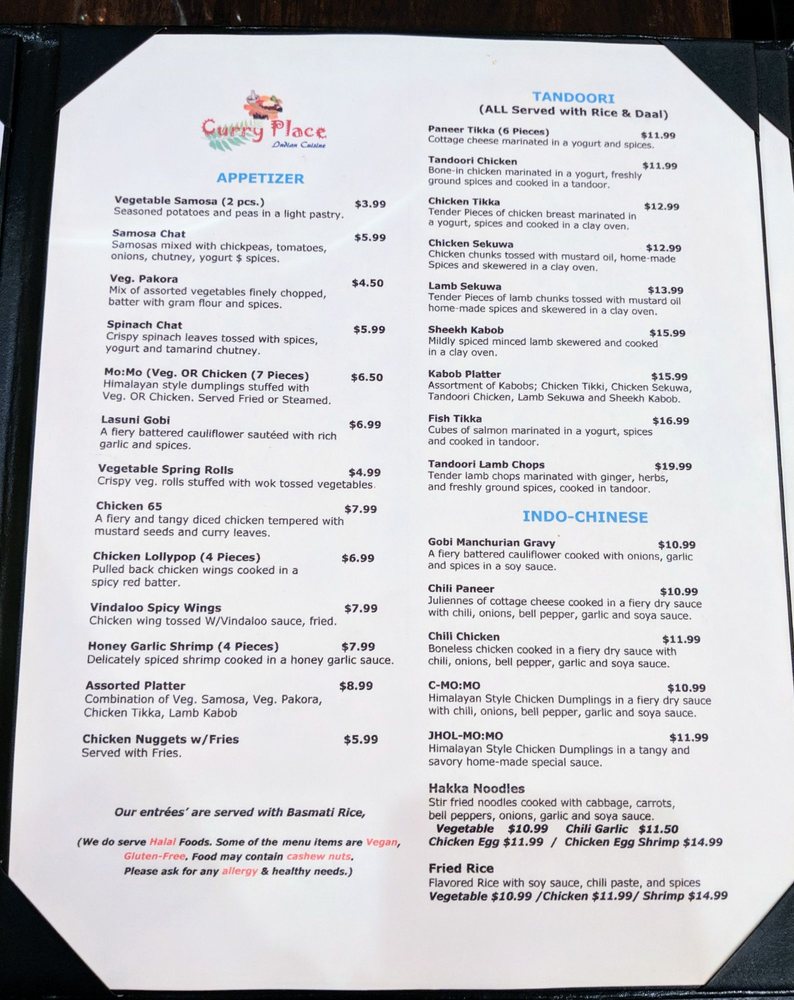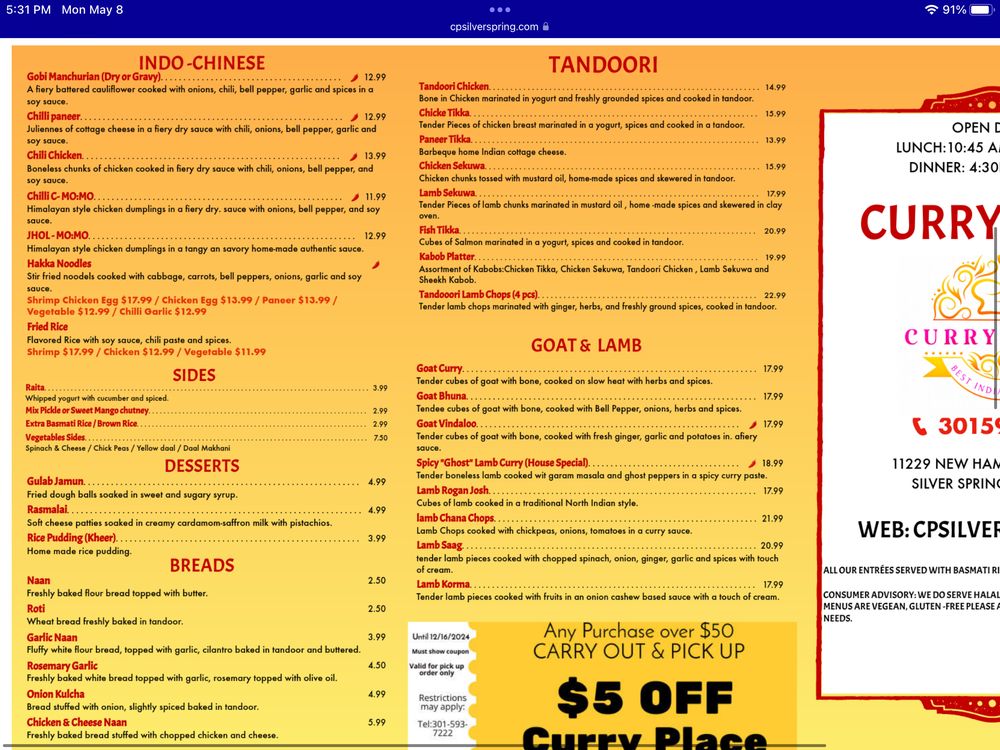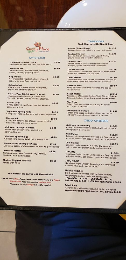 Located in Silver Spring, MD, Curry Place Indian Cuisine offers a diverse menu of Himalayan/Nepalese and Indian dishes. With options for vegans and vegetarians, this casual eatery provides a range of services like delivery, catering, and outdoor seating. Customers rave about the flavorful dishes, like the Goat and Tikka, naan bread, and spicy ghost lamb curry. The attentive service and warm atmosphere make dining here a pleasant experience. From the mouth-watering chicken momos to the rich butter chicken and flavorful vindaloo, each dish showcases authentic flavors and generous portion sizes. The friendly staff and cozy ambience add to the overall dining experience. Don't miss out on the gulab jamun and rasmalai for a sweet ending to your meal. Curry Place Indian Cuisine is a must-try for those craving delicious and authentic Indian cuisine.